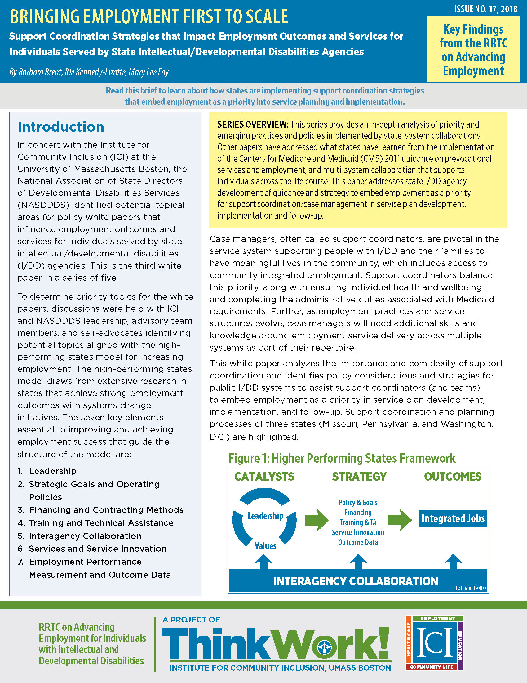 Download brief here. Leadership from NASDDDS and ICI worked together to determine topics for a series of white papers on policies that influence employment outcomes for individuals with IDD. This white paper is the third in a series of five. It provides an overview of strategies that support coordinators, or case managers, use to influence employment outcomes for individuals with IDD who are receiving state funded services.