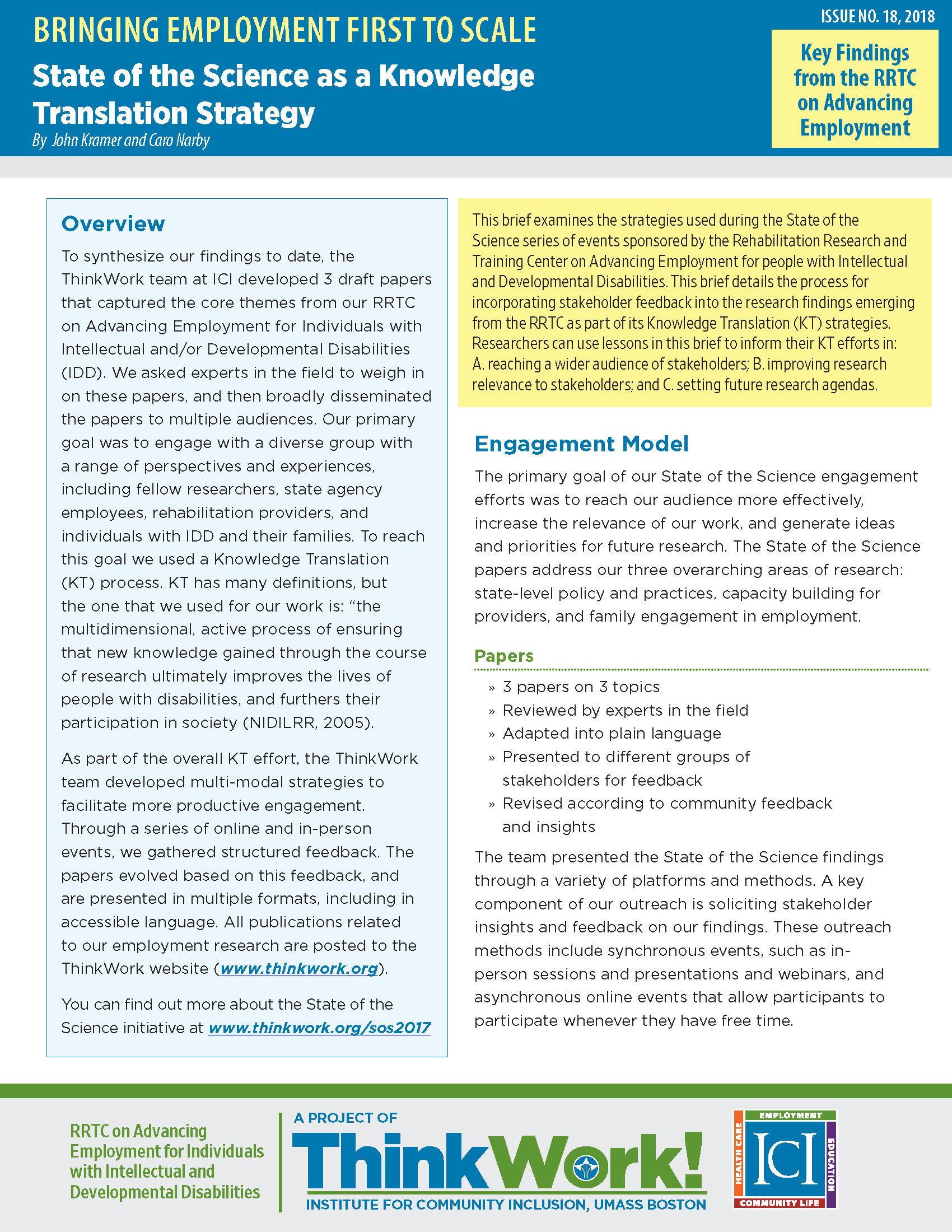 Download full brief here or read on for summary. To synthesize our findings to date, the ThinkWork team at ICI developed 3 draft papers that captured the core themes from our RRTC on Advancing Employment for Individuals with Intellectual and/or Developmental Disabilities (IDD). We asked experts in the field to weigh in on these papers, and then broadly disseminated the papers to multiple audiences. Our primary goal was to engage with a diverse group with a range of perspectives and experiences, including fellow researchers, state agency employees, rehabilitation providers, and individuals with IDD and their families. To reach this goal we used a Knowledge Translation (KT) process. KT has many definitions, but the one that we used for our work is: “the multidimensional, active process of ensuring that new knowledge gained through the course of research ultimately improves the lives of people with disabilities, and furthers their participation in society (NIDILRR, 2005). As part of the overall KT effort, the ThinkWork team developed multi-modal strategies to facilitate more productive engagement. Through a series of online and in-person events, we gathered structured feedback. The papers evolved based on this feedback, and are presented in multiple formats, including in accessible language. All publications related to our employment research are posted to the ThinkWork's State of the Science page.