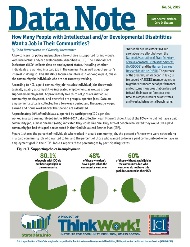 DATA NOTE No. 64, 2019 By John Butterworth and Dorothy Hiersteiner Data Source: National Core Indicators Download an accessible PDF here. Topic Other data sources Publication Date November 25, 2019